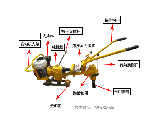 內(nèi)燃液壓螺栓扳手分為單頭的螺栓扳手及雙頭的螺栓扳手,今天為您介紹一款液壓單頭螺栓扳手型號為NLB-700,這款機器適用于鐵路、地鐵及輕軌線路的混凝土軌枕扣件螺母的松緊作業(yè)。本機采用汽油機作動力,輸出軸為單頭、單速,正反轉(zhuǎn)可調(diào),輸出扭矩可徒手調(diào)節(jié)并明確顯示,整機操作簡便,平安可靠,上下道方便。