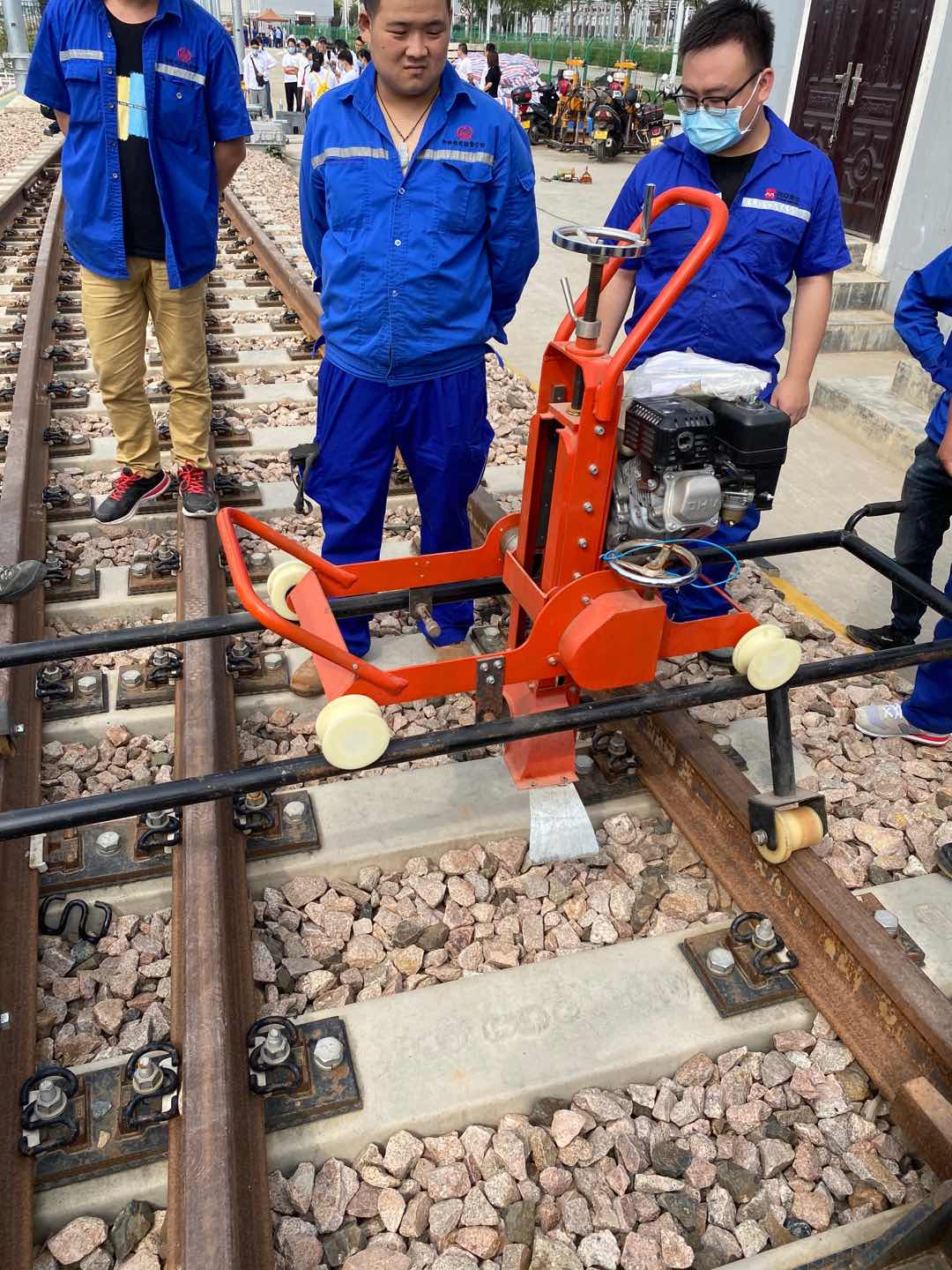 2、作業(yè)前,先將進給手輪旋轉(zhuǎn)到上邊,使砂輪遠離鋼軌面,然后將輔助支承架支承好,啟動汽油機4,空轉(zhuǎn)30秒鐘,檢查傳動部分是否靈活、有無異常雜音,螺紋連接是否松動。