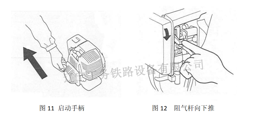 在輕輕拉啟動手柄,直到感到有阻力時再用力拉,如汽油機(jī)長時間未使用,應(yīng)連續(xù)拉動啟動手柄幾次使汽油進(jìn)入油路系統(tǒng),汽油機(jī)即可發(fā)動(見圖 11);
