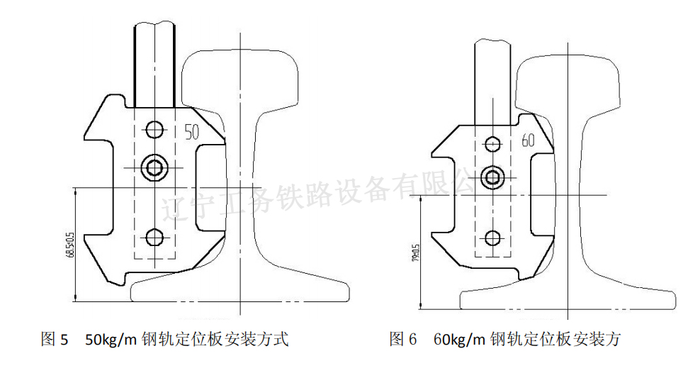根據(jù)所鉆鋼軌的類型確定定位板安裝方式,如(圖 5)是 50kg/m 鋼軌定位塊安裝方式,(圖 6)是 60kg/m 鋼軌定位板安裝方式;兩種定位方式轉(zhuǎn)換只需卸下內(nèi)六角螺釘 M10,翻轉(zhuǎn)定位板 180 度裝入,擰緊螺釘即可,兩邊定位板要同時翻轉(zhuǎn)一致。