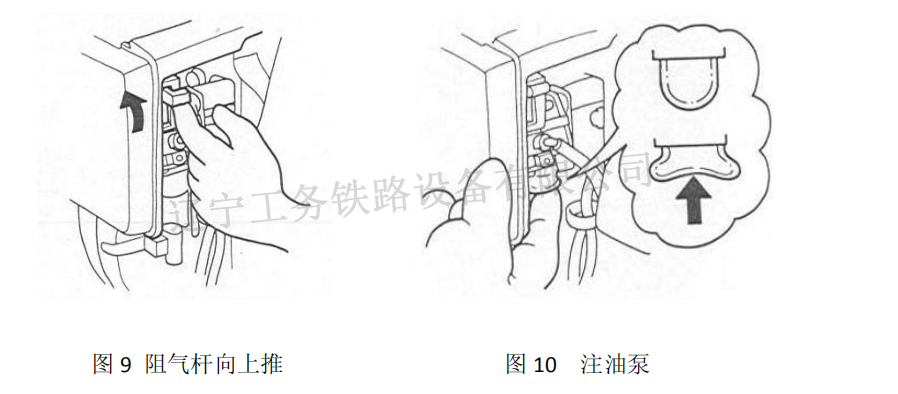 首先將汽油機(jī)的啟動開關(guān)撥至“ON”位置(處于汽油機(jī)右側(cè));然后把阻氣桿移至關(guān)閉位置(見圖 9),氣門處于關(guān)閉位置,按注油泵數(shù)次直到汽油回管中可以明顯地看到油流時為止(見圖 10)