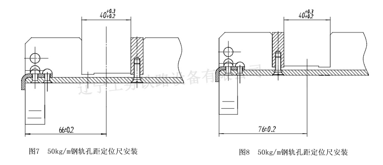 根據(jù)所鉆鋼軌類型確定鋼軌孔距定位尺安裝方式如(圖 7) 是50kg/m 鋼軌孔距定位尺安裝方式,(圖 8 )是 60kg/m 鋼軌孔距定位尺安裝方式;兩種安裝方式轉(zhuǎn)換只需卸下兩個沉頭螺釘 M5,卸下 10mm 厚定位塊,裝入另一定位槽中,擰緊沉頭螺釘即可,根據(jù)定位槽中所顯示數(shù)值 50 或 60 可判斷當(dāng)時定位軌型狀態(tài)。